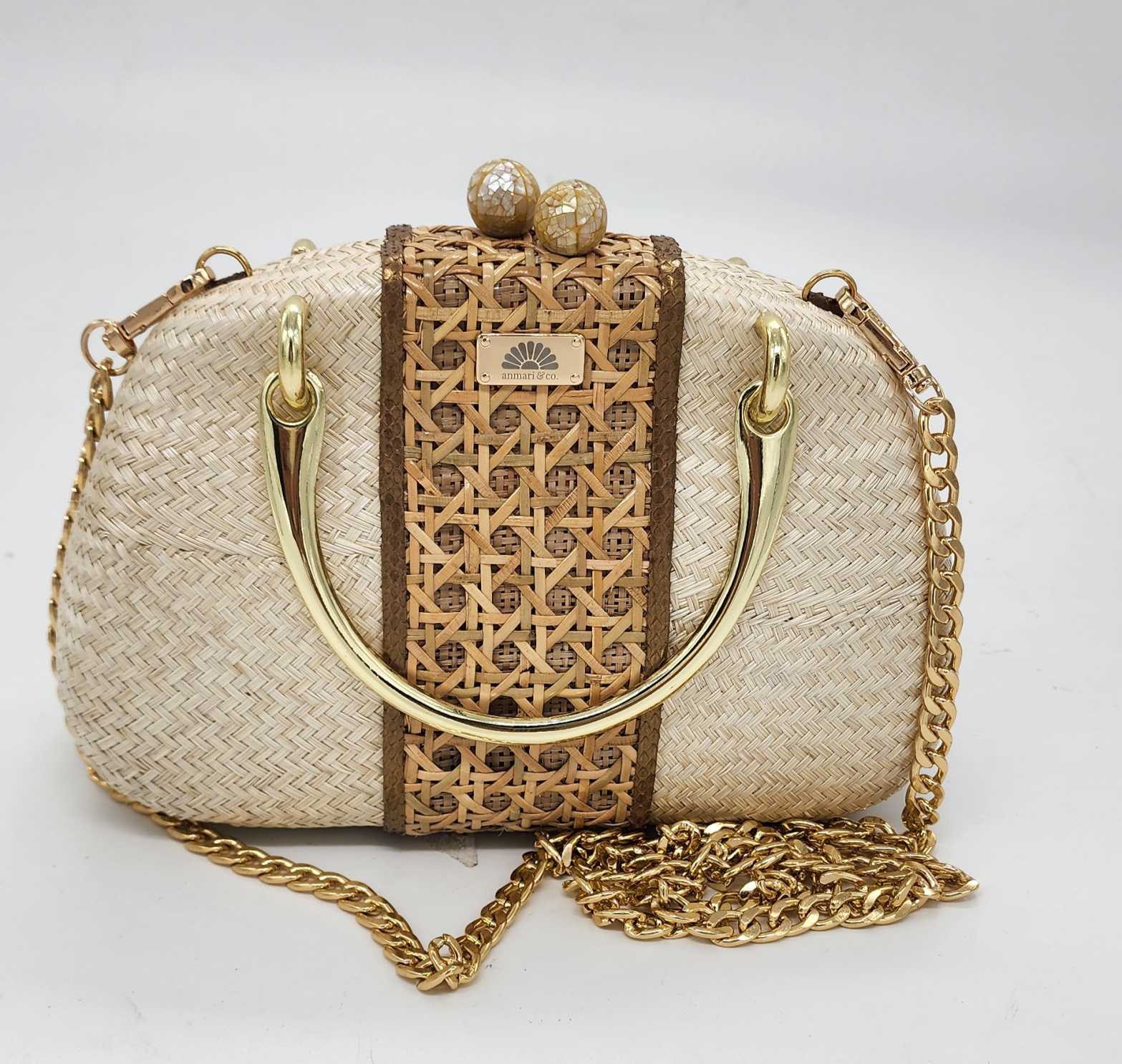 Made of buntal combined woven rattan and raffia with leather trimmings. Closure is made of mother of pearl. This comes with metal chain.